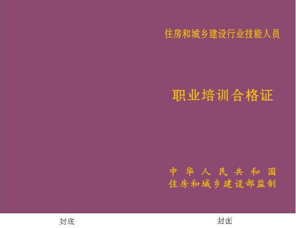 封面:“住房城鄉(xiāng)建設(shè)行業(yè)技能人員”字樣為宋體、三號(hào)、加粗,居中,段前40磅,段后40磅。“職業(yè)培訓(xùn)合格證”字樣為宋體、二號(hào)、加粗,居中,段前60磅,段后80磅。“住房和城鄉(xiāng)建設(shè)部監(jiān)制”字樣為宋體、四號(hào)、加粗,分散對(duì)齊,行距28磅,段前0磅,段后0磅。封面字樣顏色模式均為RGB,紅色245,綠色205,藍(lán)色50。