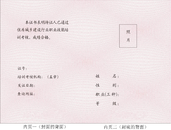 內(nèi)頁(yè)一:“本證書(shū)表明持證人已通過(guò)住房城鄉(xiāng)建設(shè)行業(yè)職業(yè)技能培訓(xùn)考核,成績(jī)合格。”字樣為楷體、小三、黑色,兩端對(duì)齊、首行縮進(jìn)2字符,段前40磅,段后50磅,固定行距26磅。“證號(hào):”、“培訓(xùn)考核機(jī)構(gòu):(蓋章)”、“發(fā)證日期”、“查詢網(wǎng)址”字樣均為楷體、四號(hào)、黑色,左對(duì)齊,段前5磅,段后0磅。