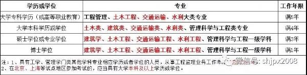 具有工程技術(shù)或工程經(jīng)濟(jì)專業(yè)大專以上(含大專)學(xué)歷,并符合下列條件之一者,可申請(qǐng)參加監(jiān)理工程師執(zhí)業(yè)資格考試。