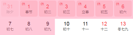 按照公司《員工手冊》規定,春節公司放假時間定為2022年1月29日(農歷臘月二十七)至2022年2月9日(農歷正月初九),共十二天,2022年2月10日(農歷正月初十)正式報到上班。