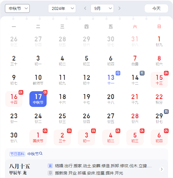 9月15日至9月17日放假調休,共三天。9月18日(星期三)正常上班。提前預祝各位同事中秋快樂!闔家團圓!